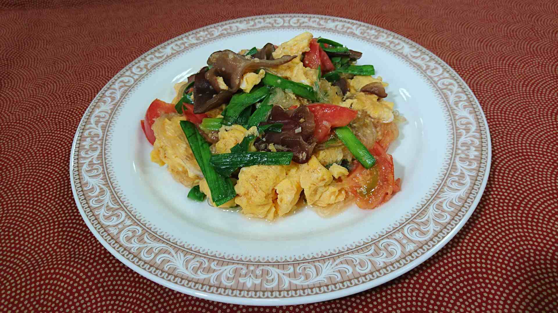 きくらげを加えてサッと炒めたら、春雨、ニラ、トマトを加えて全体を炒める。