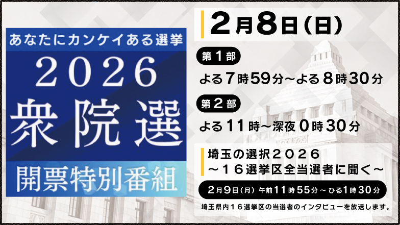 • 2026.01.27 リリース 2月8日(日)衆議院議員選挙開票特別番組 各選挙区の開票の行方を探る 県民の選択は…?翌日の昼は全当選者へのインタビューを特別番組で放送