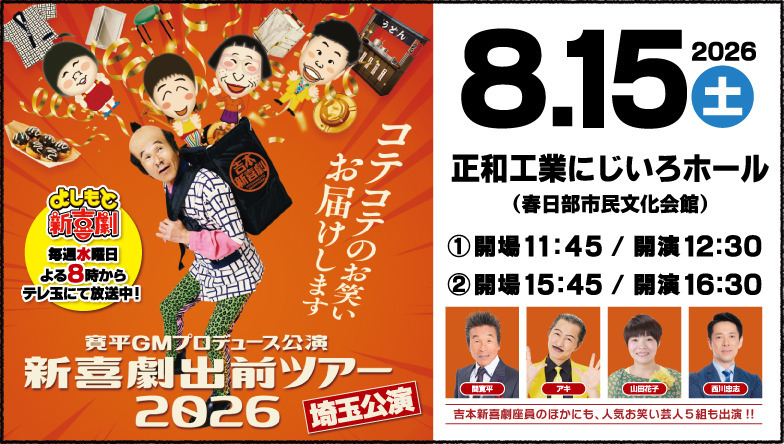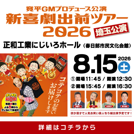 • 2025.09.05 リリース 今年も吉本新喜劇が埼玉にやって来る!新喜劇出前ツアー2025埼玉公演を10月13日に開催 笑い飯、3時のヒロインら漫才の出演者も決定!