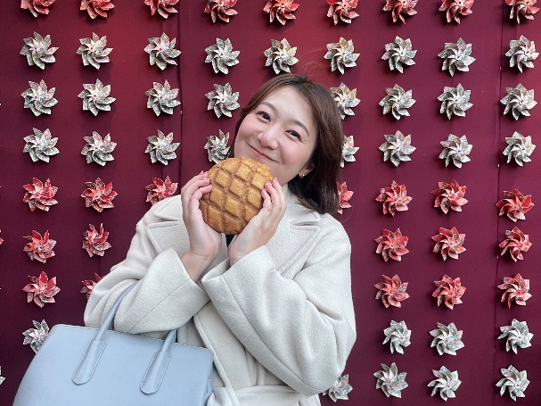 妹が撮ってくれました。メロンパンは、食品サンプルです。リアルですよね。