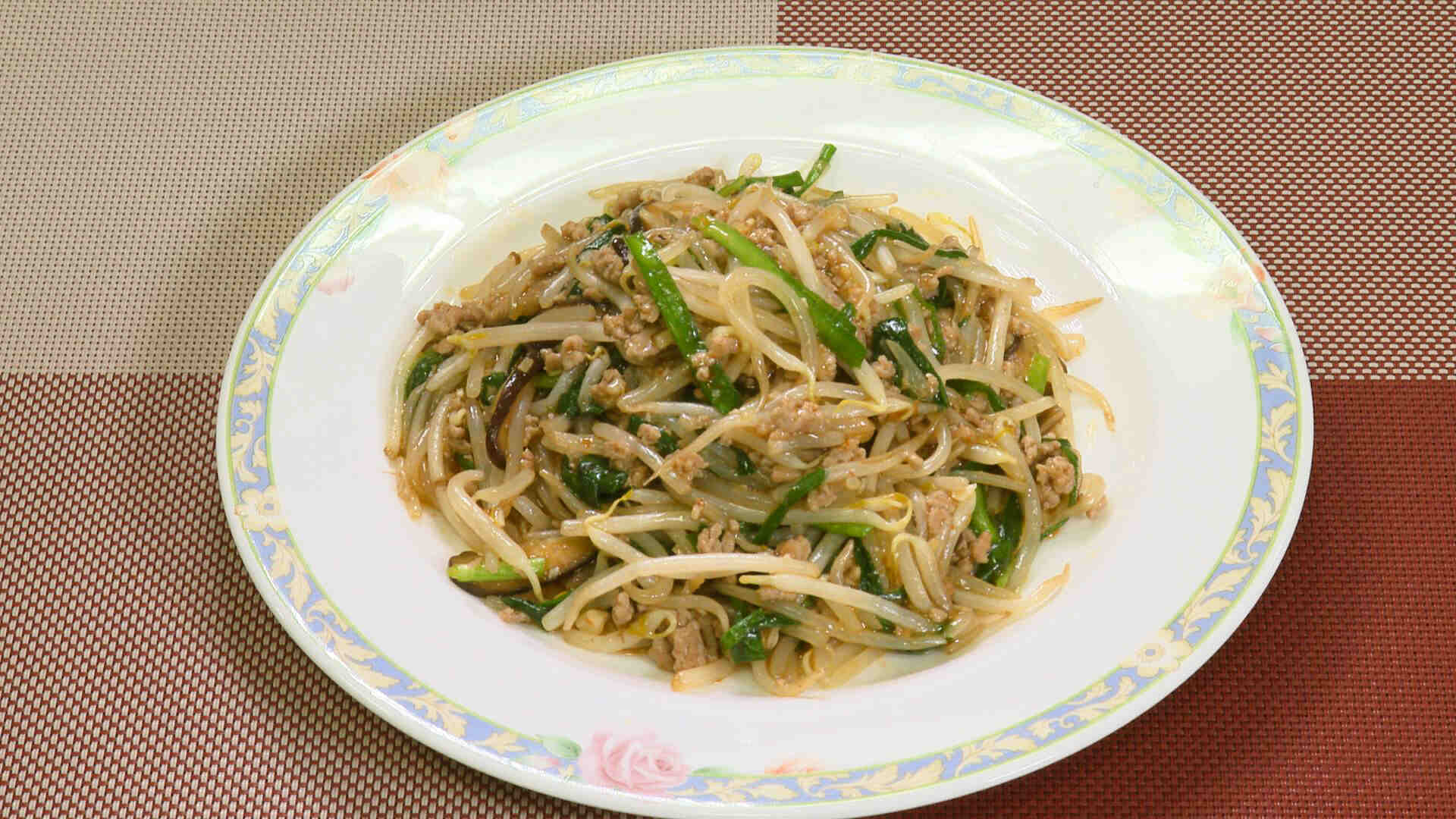 ⑤.④にもやしを加えサッと火を通し、ニラを加え<水溶き片栗>を加えてトロミをつけたら器に盛りいただく。