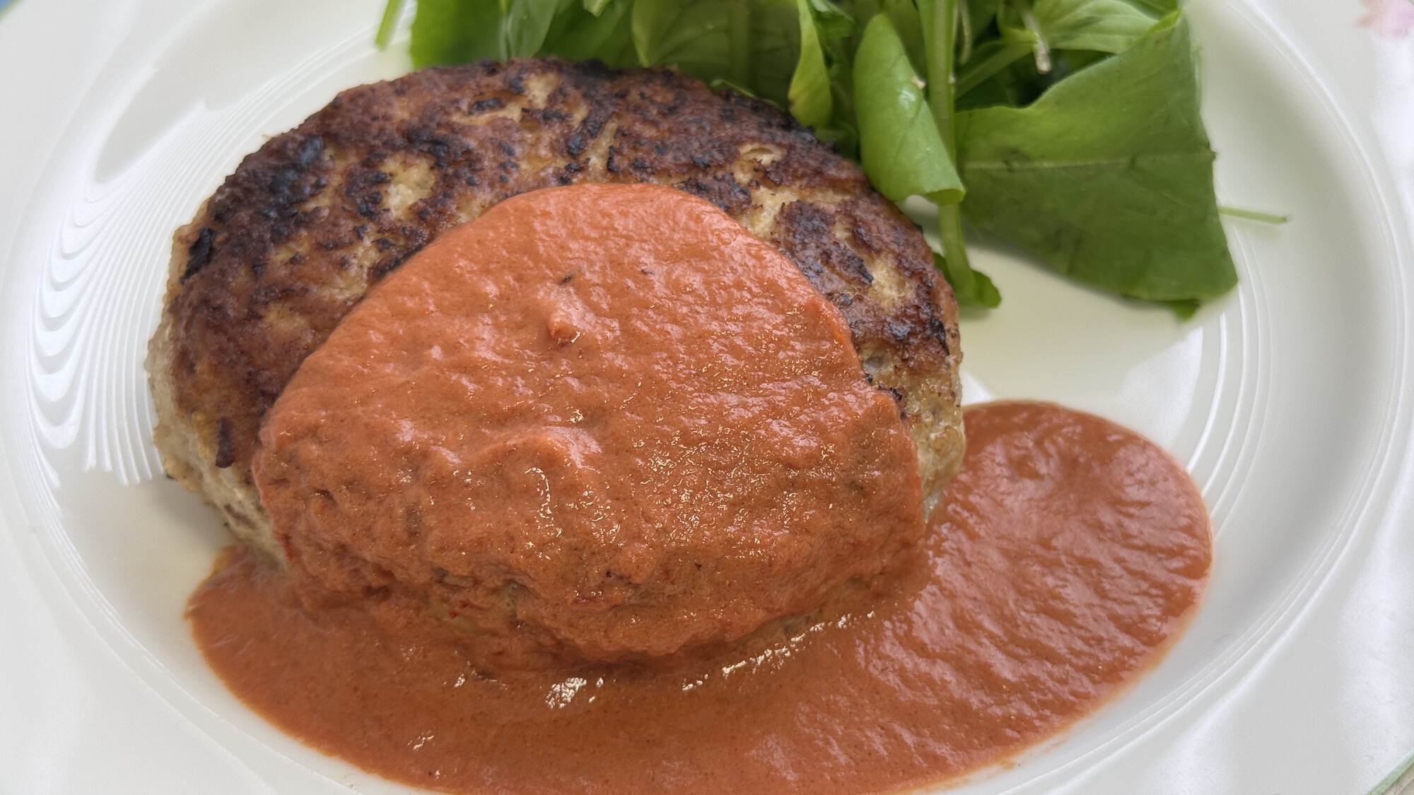 ④.③の蓋を外し、下面にも焼き色が付くまで焼く。野菜を添えた皿に④を盛り、空いたフライパンにソースの全ての材料を入れ、中火で温めながら混ぜたらハンバーグにソースをかける。