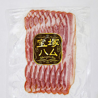 宝塚ハムの原料は厳選された新鮮な生の豚肉のかたまり肉に秘伝の塩漬剤を注入後0~3℃に保った大型冷蔵庫で2週間かけて熟成させ、長期熟成ハムさらし巻は、その後切り分けた肉の一つ一つに手作業でさらしと糸を巻いて、レンガを積んだ手作りの窯でじっくり乾燥と燻製をします。出荷まで20日間。手間ひまかけた自信作です。